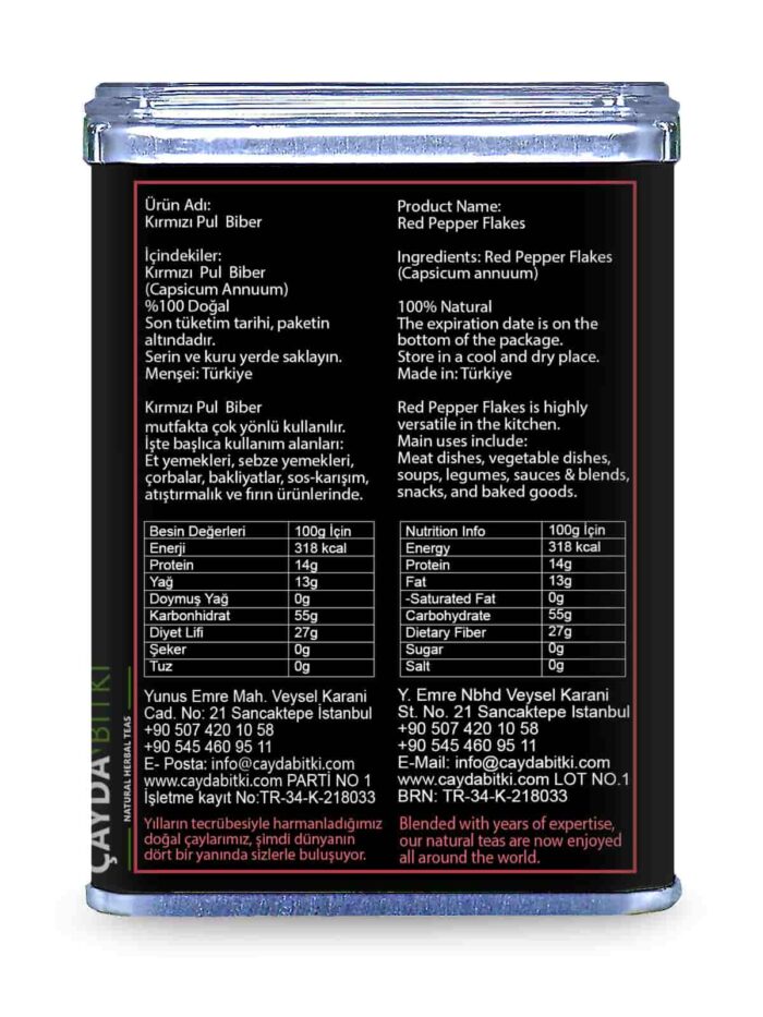 Ürün kullanımı kolaylaştırmak için metal kutularda hazırlanmış olup gıdaya uygundur. Net ağırlık: 120g